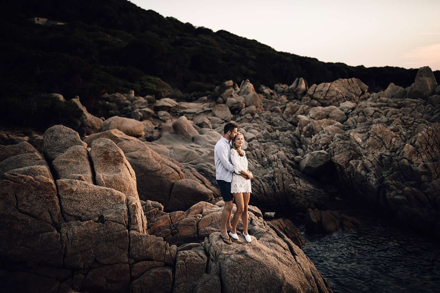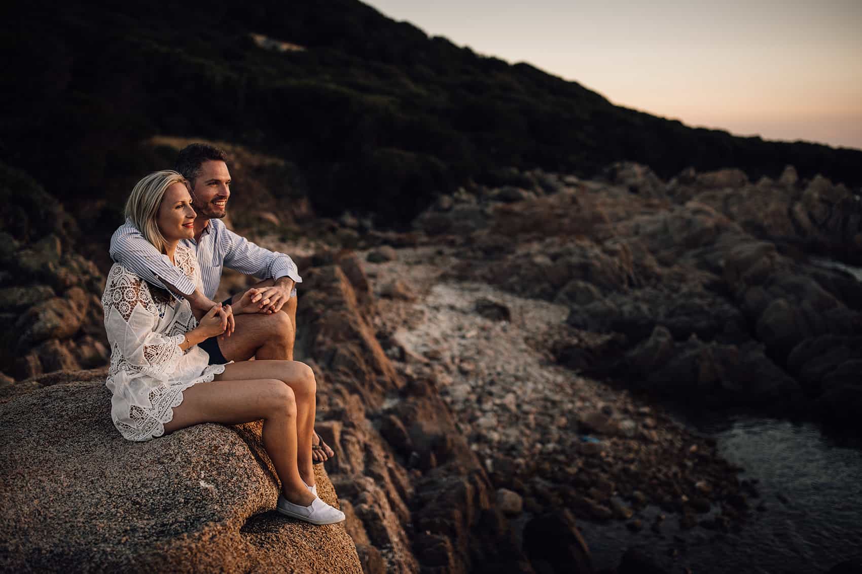 The weekend soon came round, and it kicked off with a pre-wedding gathering down at the beach, a chance for Juliette and Graeme to meet all of their guests who had made the journey, which by the sounds of it, was pretty much everyone!! Who wouldn’t want to go to Corsica for a week-long wedding party?!!! The following day (it was a 4 day weekend!!!), I met them both at Le Domaine d’Agnone, a private collection of Villas overlooking the Mediterranean sea, we did a little scout of the venue before hitting the beach to get a few shots of these guys in the last little bit of sunlight. It turns out rock climbing and flip-flops aren’t a suitable match, ay Graeme?!!!